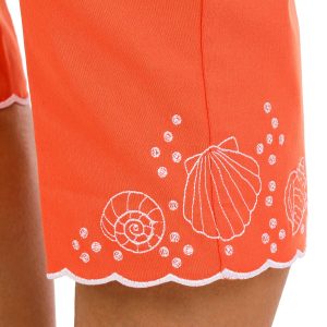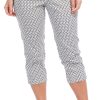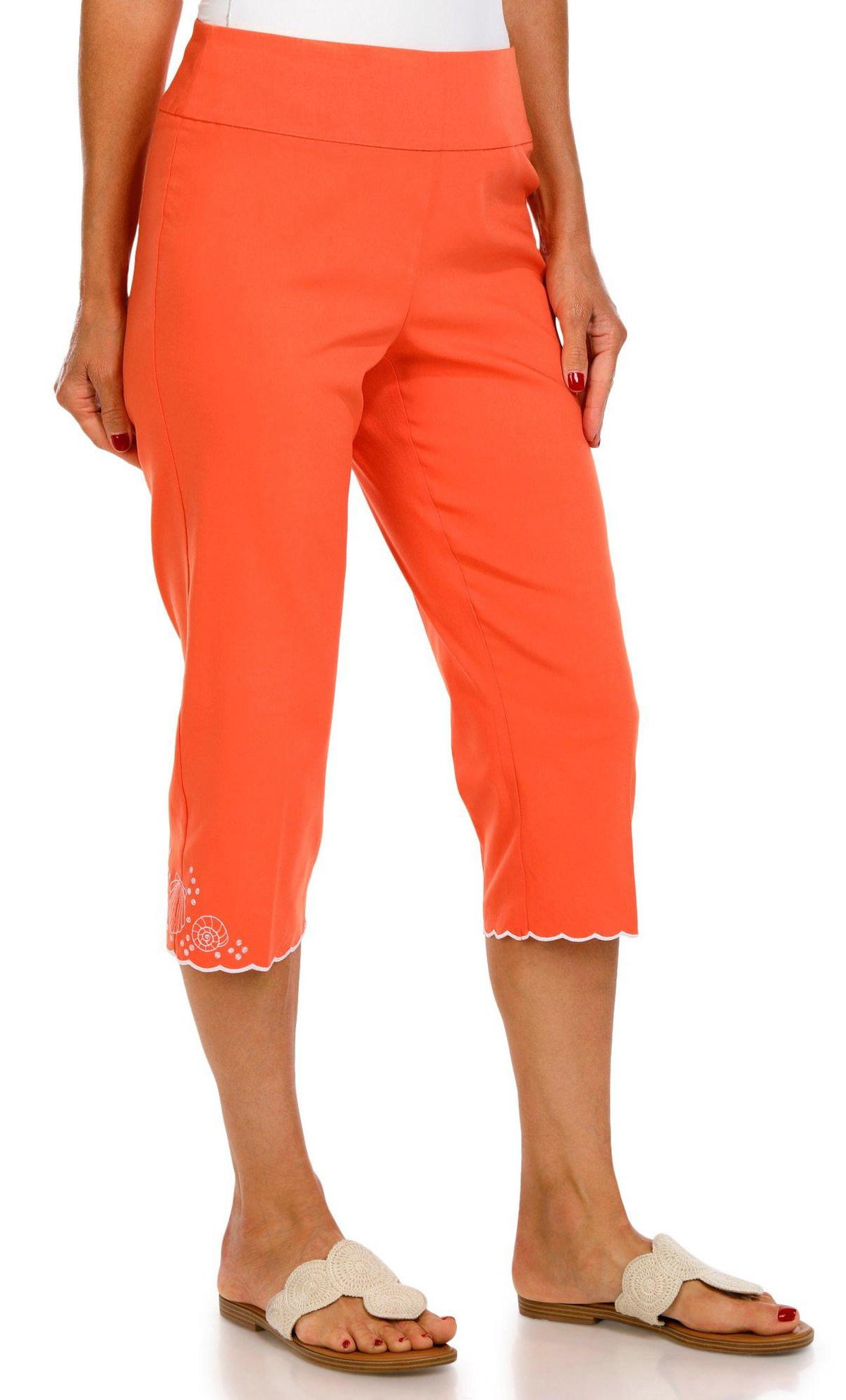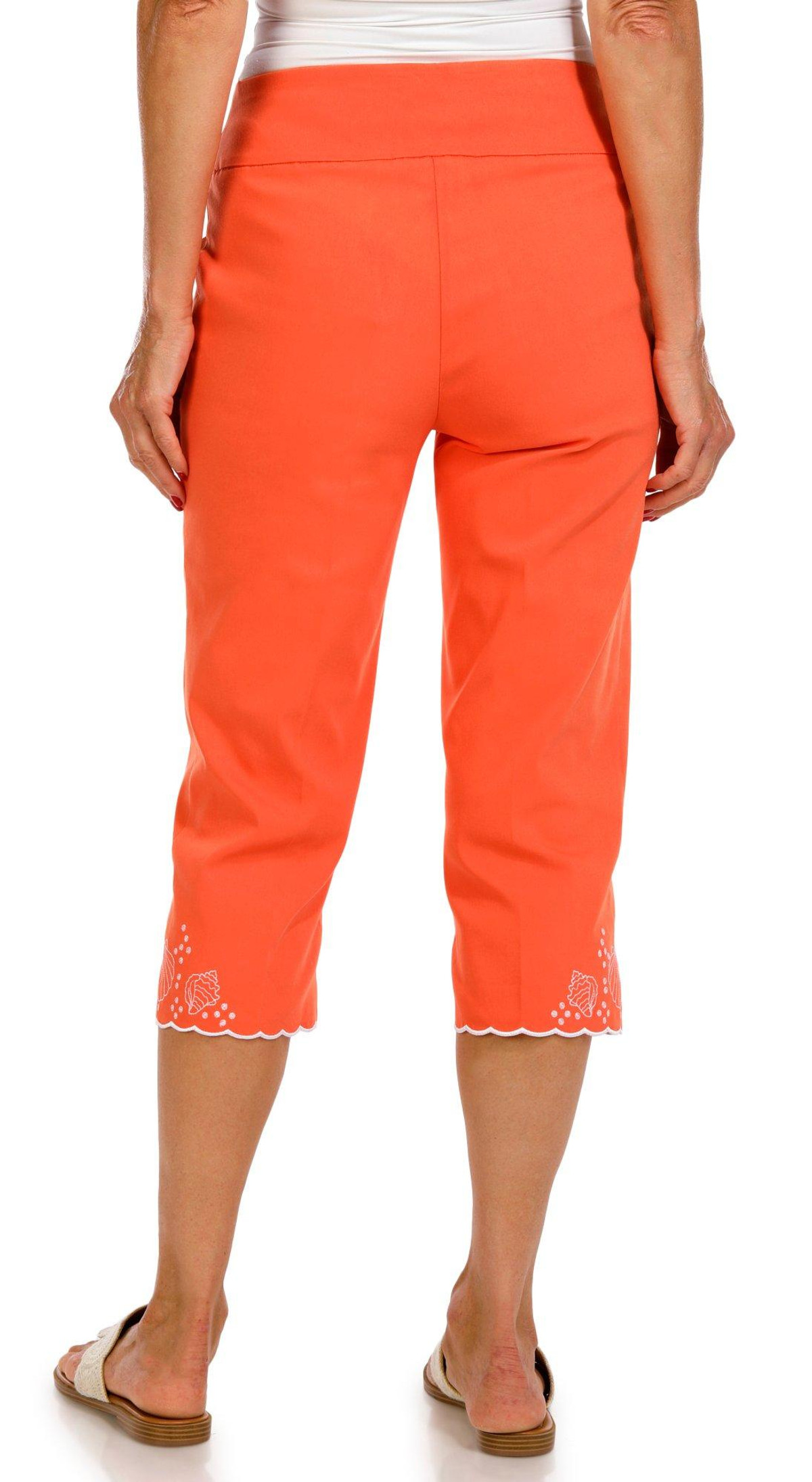 These women’s crop pants feature a pull on waistband and a solid color with a scalloped, embroidered hem. With a straight leg cut, they offer a comfortable fit and a touch of detail for a polished everyday look.
