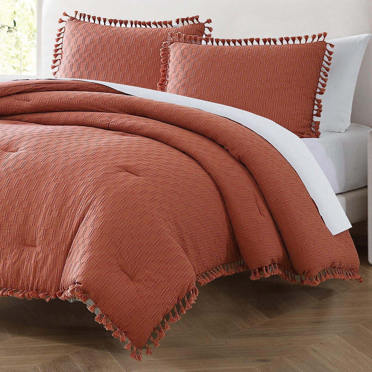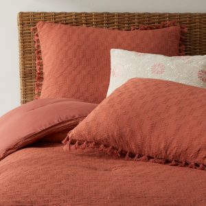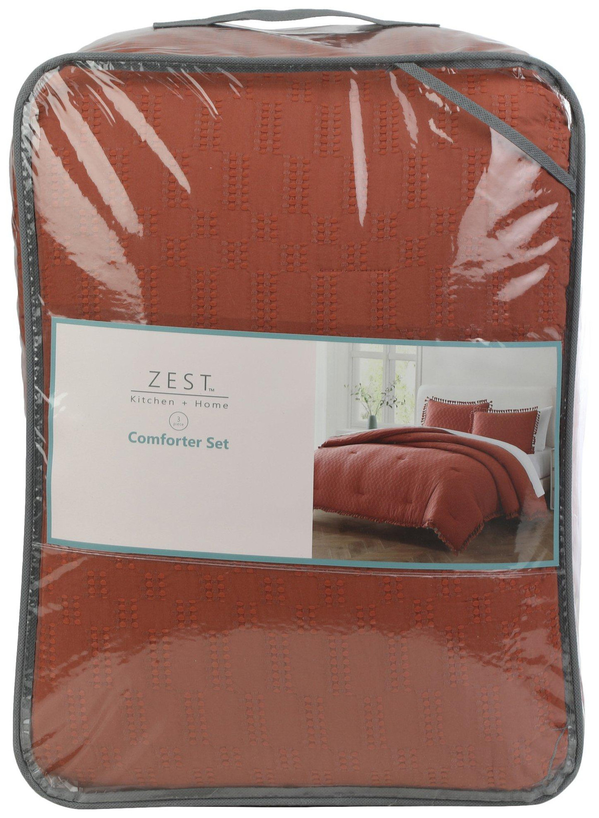 ZEST Kitchen + Home is designed to help you celebrate life every day. Our passion for quality embodies every product, providing timeless style with a modern touch. Only available at Bealls Florida! This comforter set features a solid color design with tassel trim details, 1 standard size comforter (full measurements for each size in traits) and two shams (1 included with the twin set.) Fabrication is cotton and polyester. Certified STANDARD 100 by OEKO-TEX.